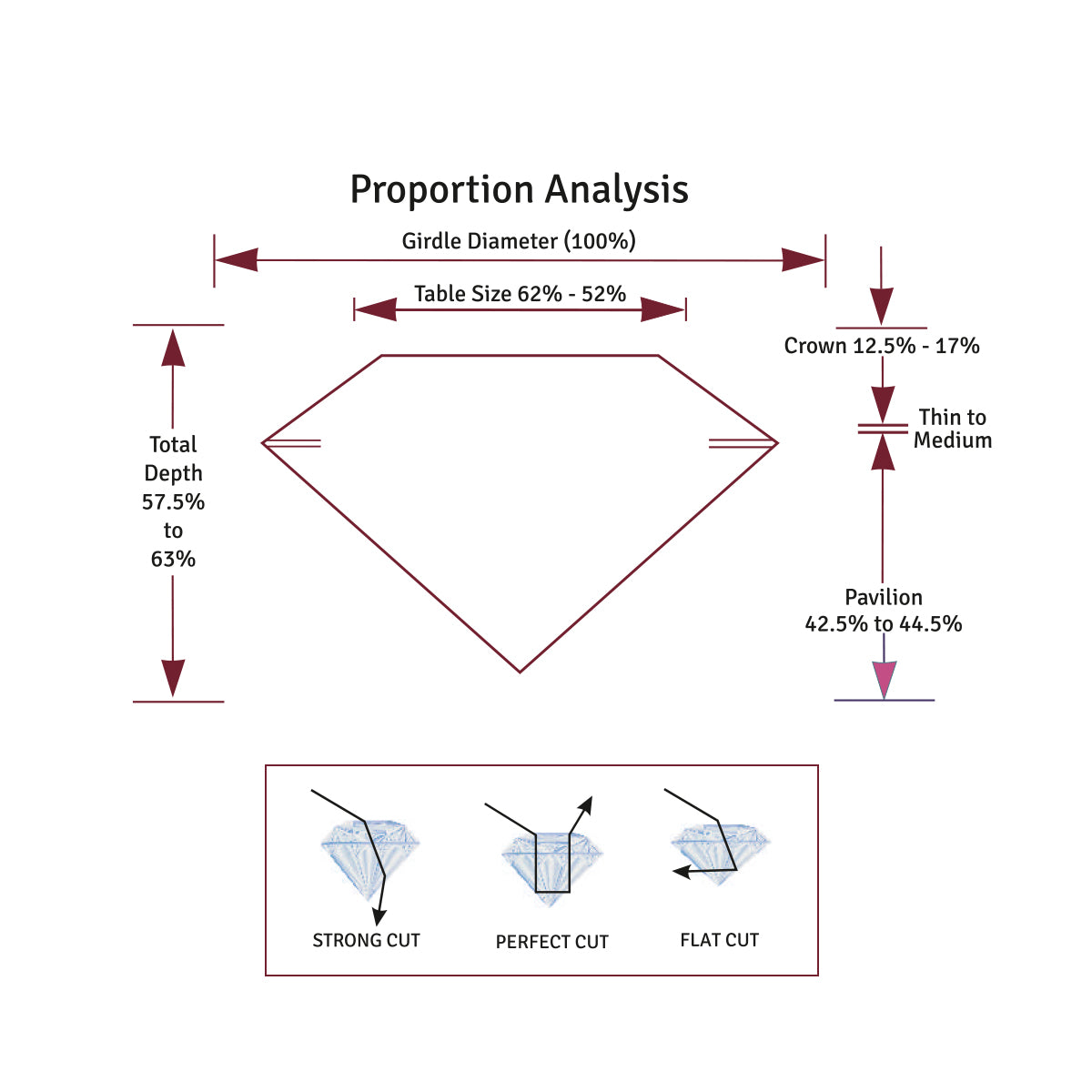 The cut of a diamond is the measure of how the diamond’s facets interact with light. It is the most important characteristic that affects the brilliance and sparkle of the diamond.